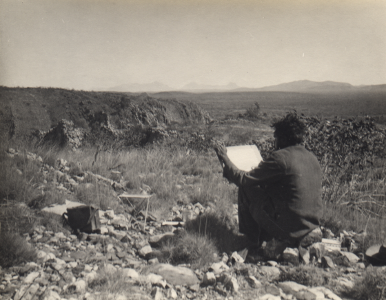 This photograph, held at the Museum of South Australia, shows the Hermannsburg artist, Albert Namatjira, painting Mt Sonder (Rutjubma). The date of the photograph is unknown. According to F.W. Albrecht, (Strehlow's successor), Namatjira was 'about nineteen [when] he married Elkalita (sic), the only daughter of Wappiti (sic) and Membata, members of the Loritja tribe.' The pair married in the 'native way, by going bush for marriage and honeymoon' in response to Carl Strehlow's disapproving view of Christian natives marrying outsiders. Albrecht claims this atmosphere 'had a definite effect on' Namatjira and 'through it he entered into a new phase of life'. See F.W Albrecht's article, 'Albert Namatjira Native Artist', in the Aborigines' Friends Association pamphlet, (1950, no page numbers), State Library of South Australia. |