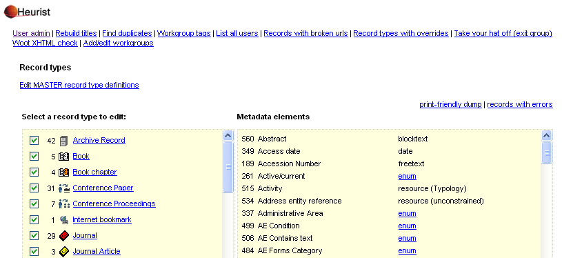 Heurist's adminstration page (accessible only to Administrators) allows the management of users (authorisation, passwords, group ownership etc.), the instant definition of new record types and fields (attributes), as well as a number of useful maintenance and data checking functions: