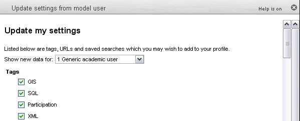 When you select a profile from the pulldown, the screen will show you all the resources from that profile which are not already bookmarked in your personal space (this allows you to revisit profiles and perhaps find new resources which have been added since).