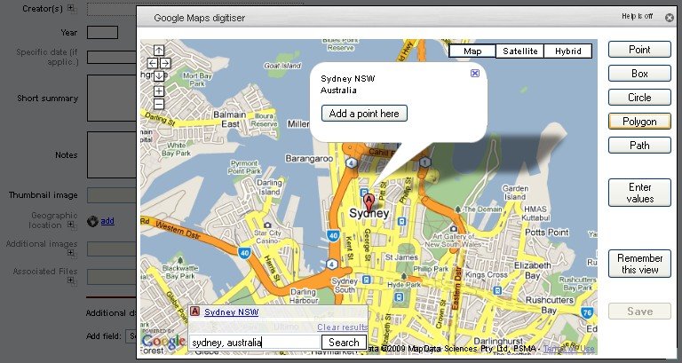 The geographic location of an event, organisation, historic site etc can be added into the public information using a digitising function based on Google Maps.