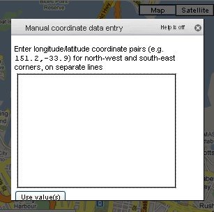 If you have latitude/longitude coordinates you wish to type in, click on an object type, then click on Enter values. A box with instructions appropriate to the particular type will be displayed: