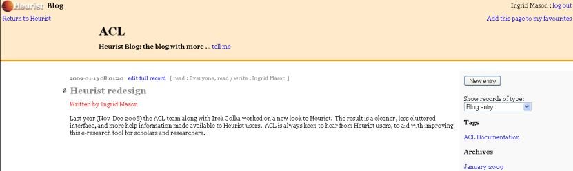 Heurist provides a blog function with many interesting additional features. The strength of Heurist's blog function is that it stores its blog entries as standard Heurist records. They therefore inherit all the capabilities of standard Heurist records; they can be searched for, tagged, annotated, linked and even mapped like any other Heurist record. In fact, any Heurist record type can be displayed in a Heurist blog, although the default type is Blog entry.