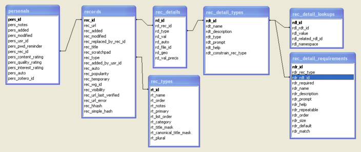 Heurist implements a number of original underlying data structuring methodologies. Entities are represented by a record in a primary database table. Attributes of entities are represented by records in an instance table linked by a foreign key to the primary table. Record types in the primary table and the metadata elements used to store attributes are defined in a series of lookup tables which define the use of both unique and shared attributes in different record types – definitions are thus soft-coded and can be modified without rebuilding the database.