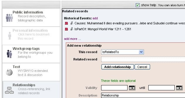 A relationship record is simply a normal Heurist record and it can be searched for and edited like any other record. This means that it can be annotated with text or a discussion such as questions of historical interpretation, its ownership and visibility can be set, it can be tagged and so forth, like any other record. This can be extremely useful with historical data in order to represent differing views or to tag set of relationships in order to present a cluster of events in a timeline.